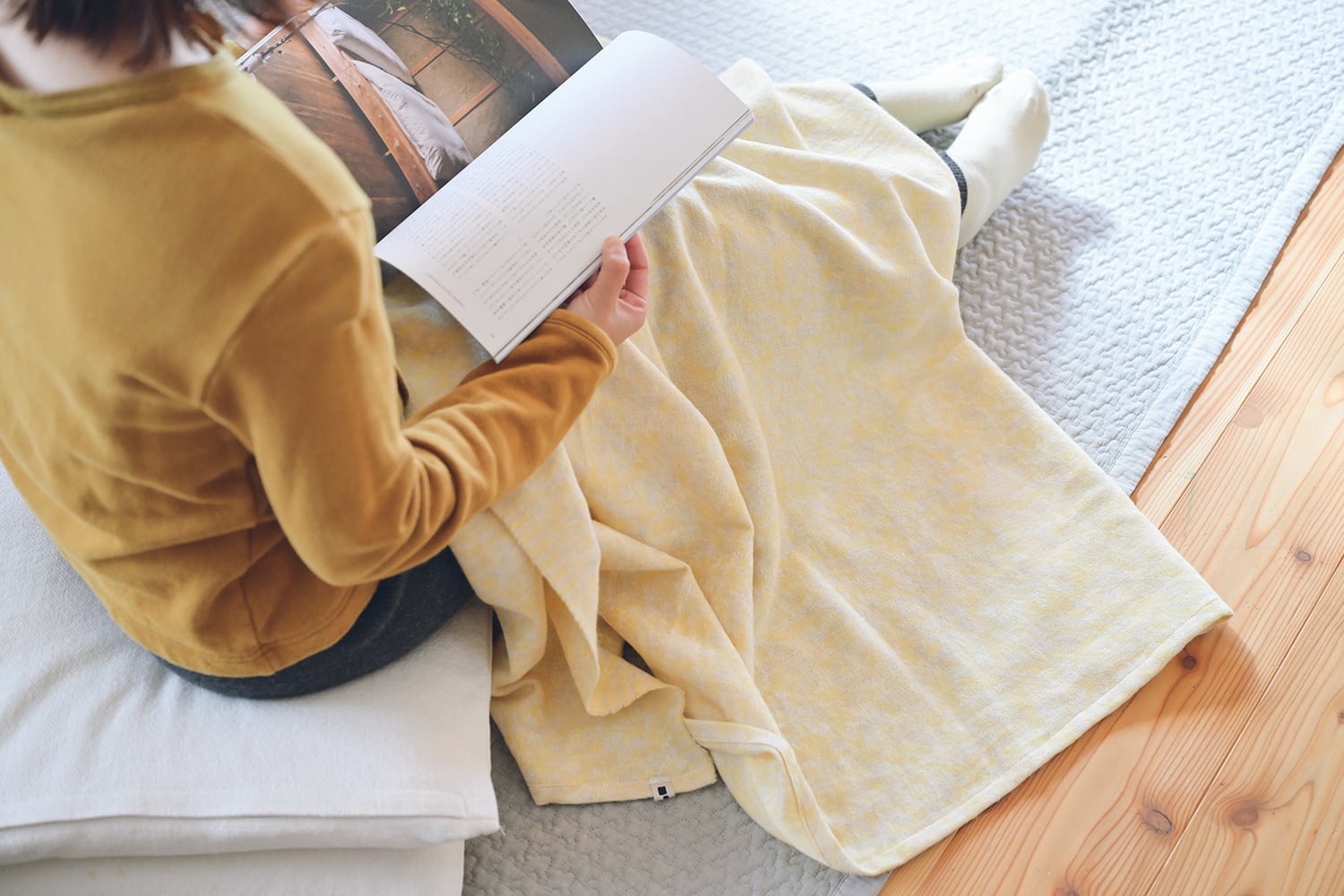 ふんわり、なのにかさばらない 1921年創業の老舗「前田源商店」の確かな技術。細い糸を丁寧に柔らかく織り上げ、起毛加工を施すことで、安心感のあるふんわりとした質感を実現。驚くほど軽く、収納性にも優れています。